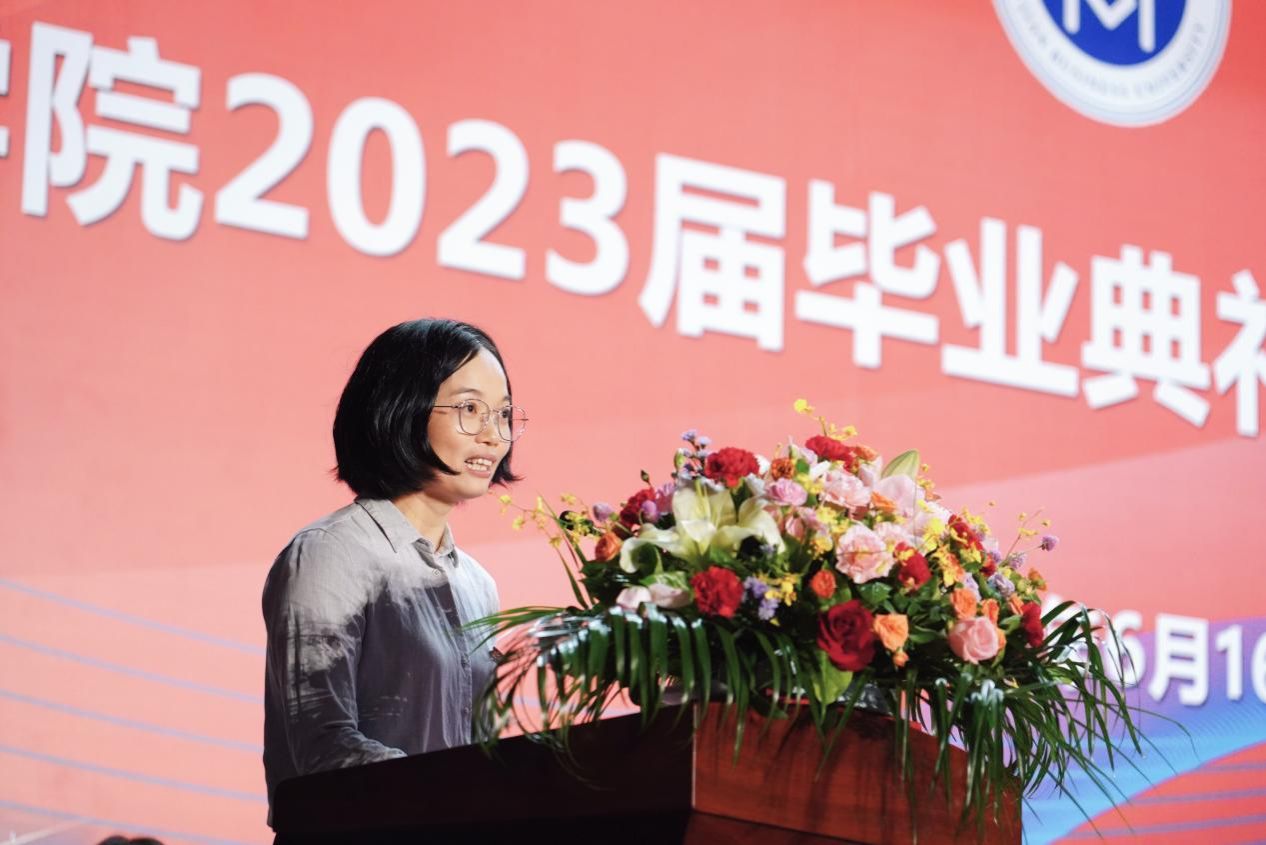 教师代表财务与会计学院吴榕花发言,希望同学们牢记习近平总书记的嘱托,不负韶华,不负时代,不负人民,在青春的赛道上奋力奔跑。