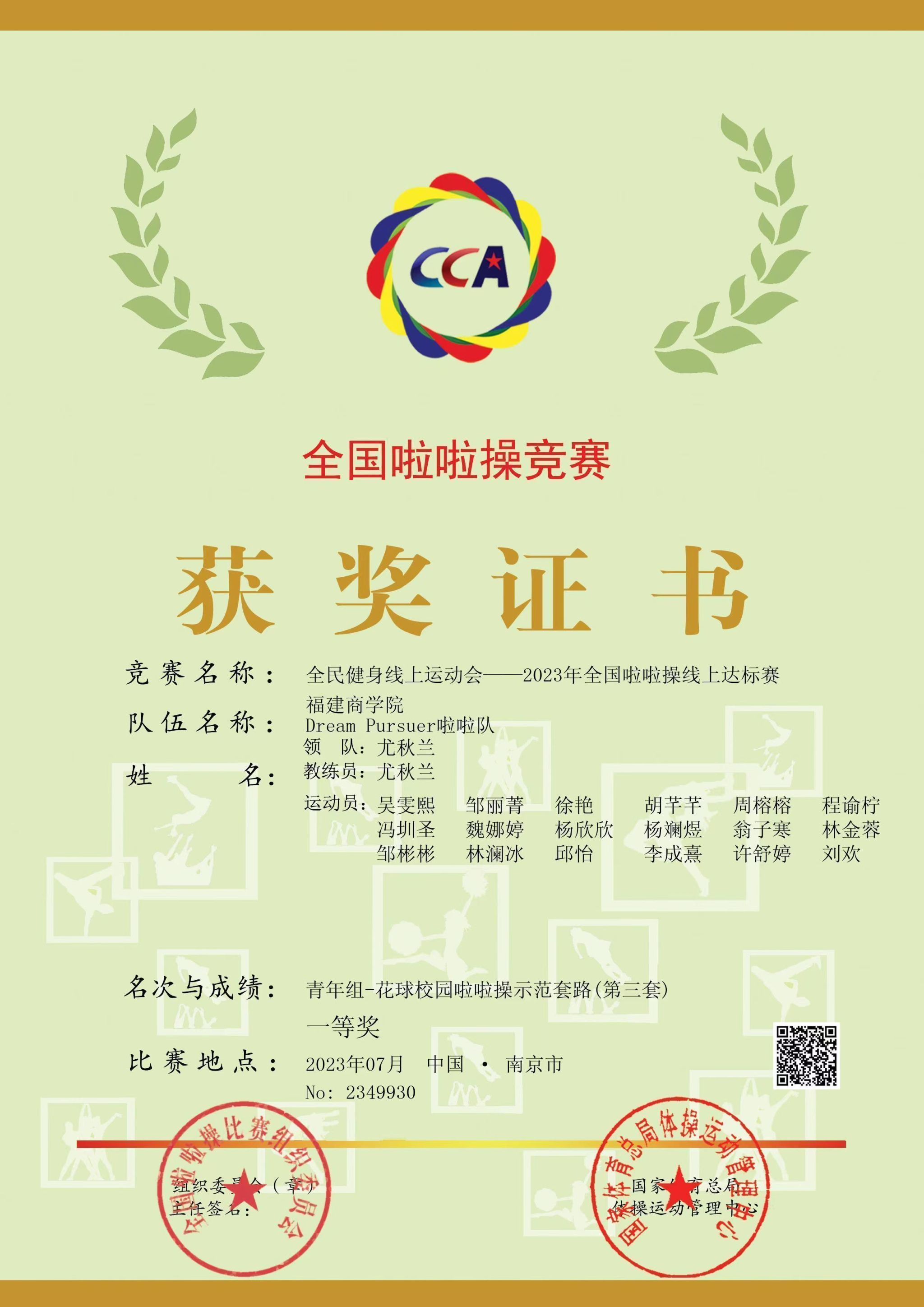 8月4日,由国家体育总局体操运动管理中心、中国蹦床与技巧协会主办,中国蹦床与技巧协会啦啦操分会承办的2023年全民健身线上运动会——全国啦啦操线上达标赛圆满落下帷幕,永利官网Dream Pursuer啦啦队(教练员:尤秋兰)以560高分获得了青年组—花球校园啦啦操示范套路一等奖。